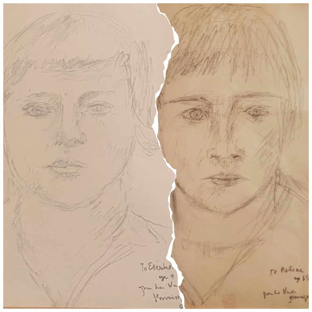 Truth is nothing can compete with being sketched into art by a family member who wrote poetry and essays and who made paintings for a living. The session with our semi-famous Great Uncle had a lasting effect on our lives. Shirley made it all happen. Uncle Jennings passed away in 1959.