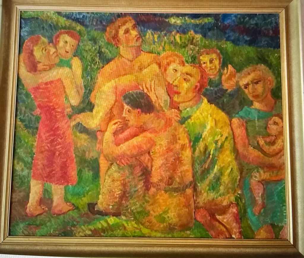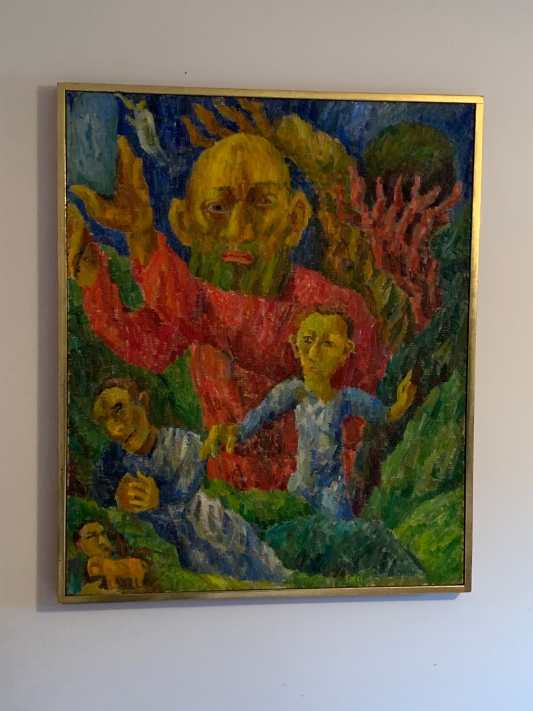 Uncle Jennings’ pictures are truly haunting. His figures are often distorted, like his own body. He used brilliant large swaths of color on the canvas. Many of his pictures portray biblical themes. When you see his paintings you never forget them.